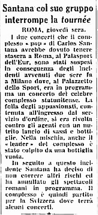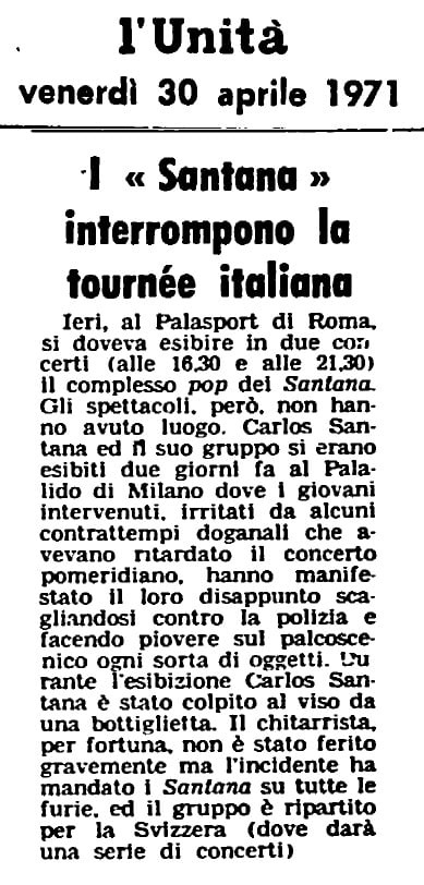 Press Review l’Unità: The "Santana" band interrupts their Italian tour. Yesterday, at the Palasport in Rome, the pop group Santana was scheduled to perform two concerts (at 4:00 PM and 9:30 PM). However, the shows did not take place. Carlos Santana and his group had performed two days ago at the Palalido in Milan, where the young people in attendance, irritated by some customs delays that had postponed the afternoon concert, expressed their displeasure by lashing out against the police and throwing all sorts of objects onto the stage. During the performance, Carlos Santana was hit in the face by a small bottle. Fortunately, the guitarist was not seriously injured, but the incident infuriated the Santana band, and the group left for Switzerland (where they will give a series of concerts).